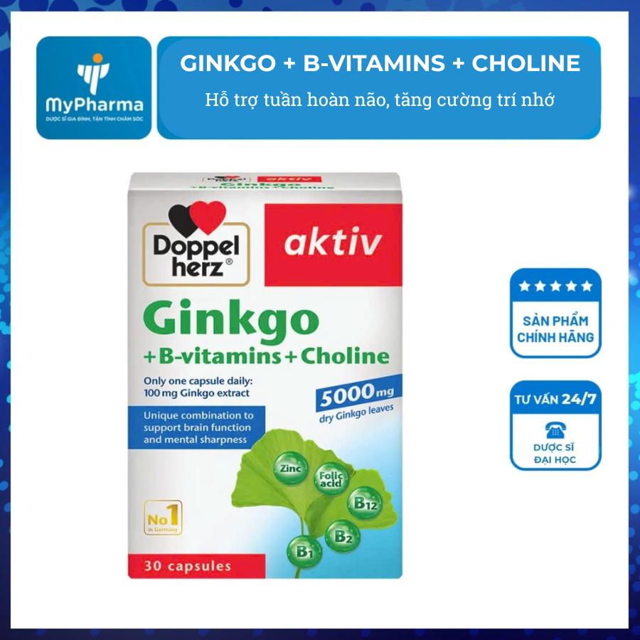 Doppelherz Ginkgo + B-Vitamins + Choline là thực phẩm bảo vệ sức khỏe thuộc thương hiệu uy tín Doppelherz (Đức), công dụng hỗ trợ tuần hoàn não, cải thiện trí nhớ và tăng cường chức năng não bộ. Sản phẩm dạng viên nang, đóng gói 30 viên, dùng hàng ngày để hỗ trợ hoạt động não bộ khỏe mạnh. Trong bài viết này, dược sĩ MPG sẽ cung cấp toàn bộ thông tin về sản phẩm Doppelherz Ginkgo + B-Vitamins + Choline, giúp bạn dễ dàng lựa chọn hơn khi mua hàng.