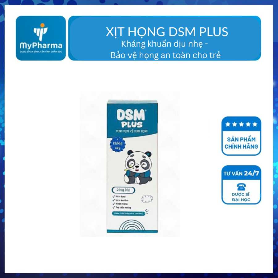 Xịt họng DSM Plus – Kháng khuẩn dịu nhẹ & Bảo vệ họng an toàn cho trẻ là sản phẩm chăm sóc và bảo vệ khoang miệng – hầu họng hằng ngày, giúp giảm nhanh các triệu chứng đau rát họng, khản tiếng, viêm nhiễm niêm mạc họng nhờ cơ chế làm sạch, kháng khuẩn, làm dịu tự nhiên. Sản phẩm hỗ trợ cho trẻ từ 0 tháng tuổi trở lên trong các trường hợp viêm họng, viêm amidan, nhiệt miệng, tay chân miệng.